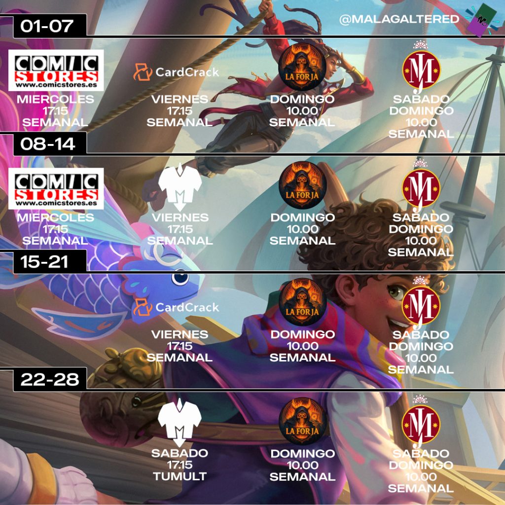 Y por último, en colaboración con MalagAltered, SimonV TCG y Mulligan, os traemos juego semanal el segundo viernes del mes, y el último sábado tendremos el Tumult Crafted Edition, con muchísimos sorteos para todos los asistentes. Y si: por muchos, es muchos.