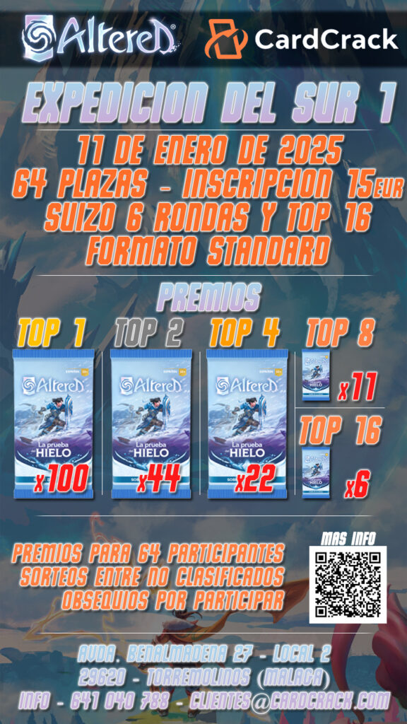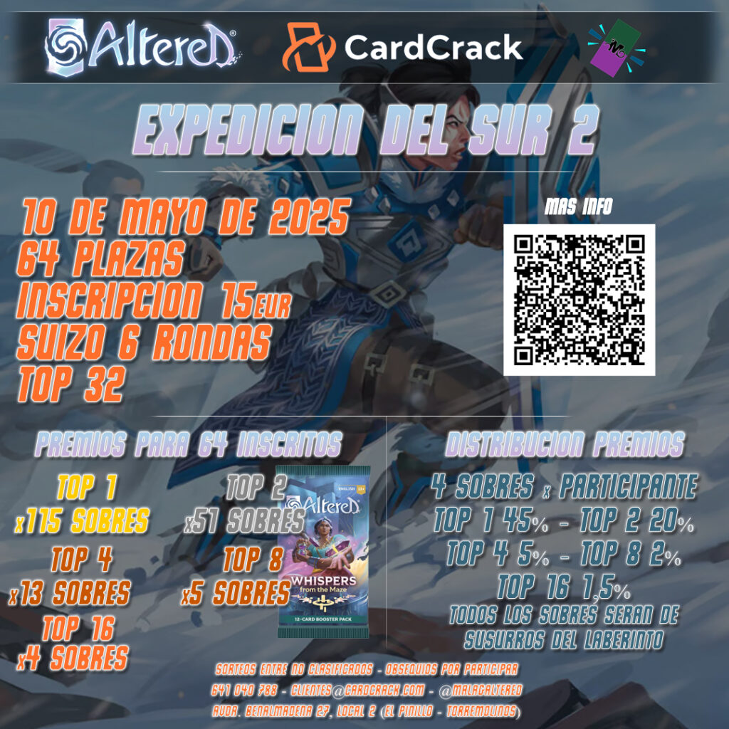 Con el objetivo de reunir a jugadores de todos los lados para coronar a los mejores jugadores de Altered, organizada con MalagAltered y CardCrack, llevamos ya 3 ediciones (y preparando la cuarta). Aunque el foco es competitivo, la idea es poder facilitar a todos los jugadores mejor acceso a cartas de los sets nuevos, por eso se celebran en el mismo mes que se lanza el siguiente set.